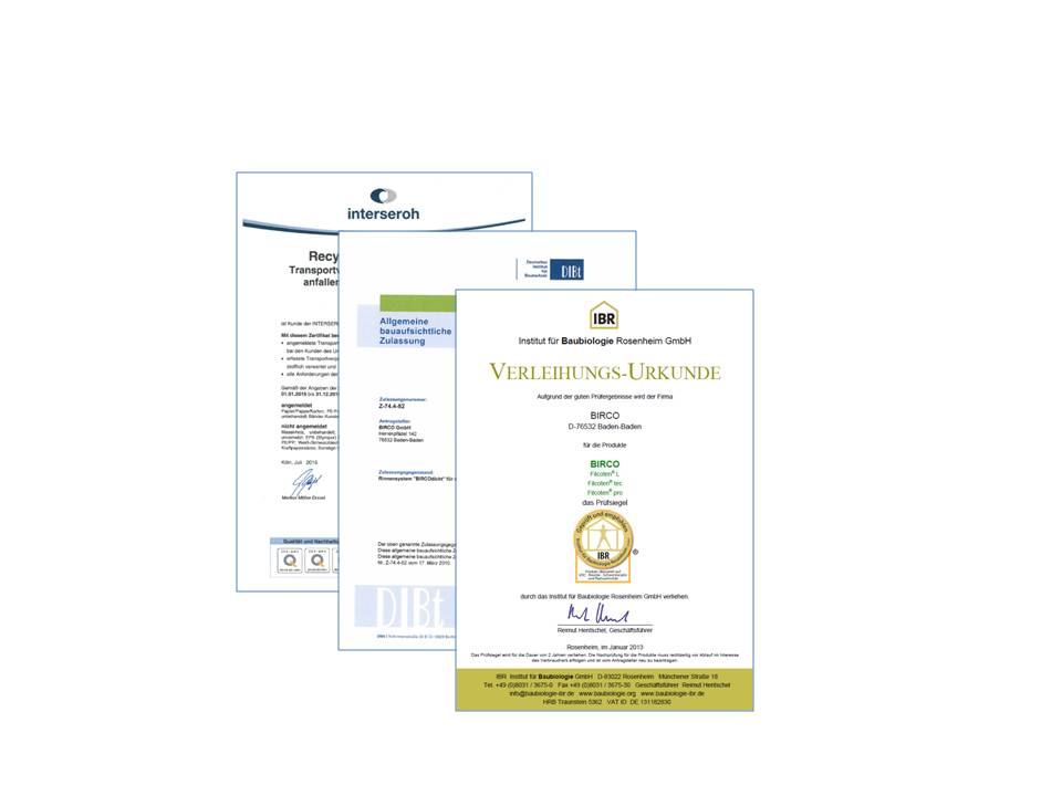 Aufgrund der lückenlosen Qualitätskontrolle entsprechen BIRCO Produkte nicht nur den geforderten DIN-Normen, sondern sind auch von verschiedenen Bauaufsichtsstellen zertifiziert. Ein Standard, auf den wir stolz sind und den wir täglich weiter verbessern.